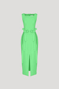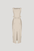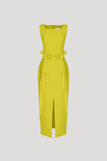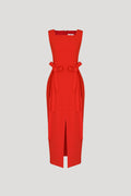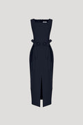 Sleeveless square-neck crepe midi dress with waist bow details.