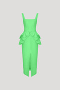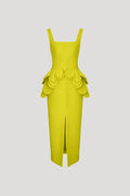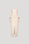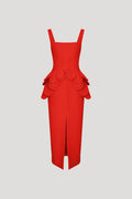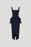 Sleeveless pencil midi dress with a scalloped layered peplum.