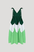 Sleeveless tiered color-block maxi dress with a V-neck and shoulder ties.