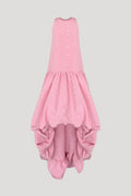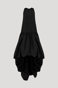 Sleeveless textured high-low gown with a voluminous bubble hem.