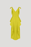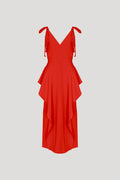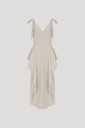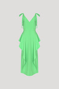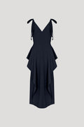 Sleeveless V-neck midi dress with peplum and tie shoulders.