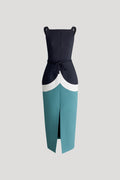 Sleeveless square-neck midi dress with a color-block panel, a tie waist, and a front slit.