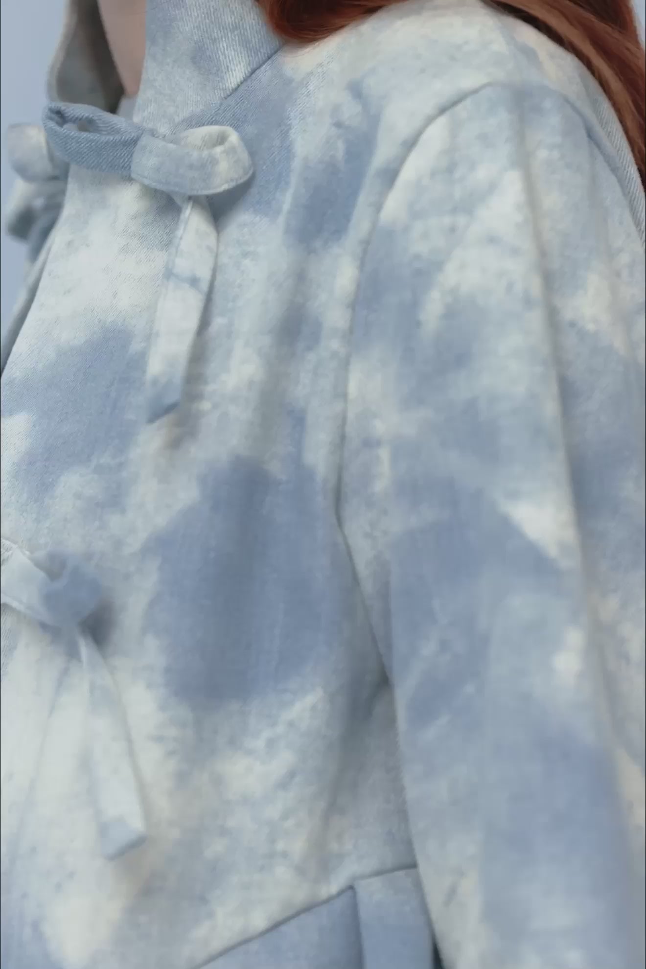 Denim jacket with frog closures, a mandarin collar, and an handkerchief hem.