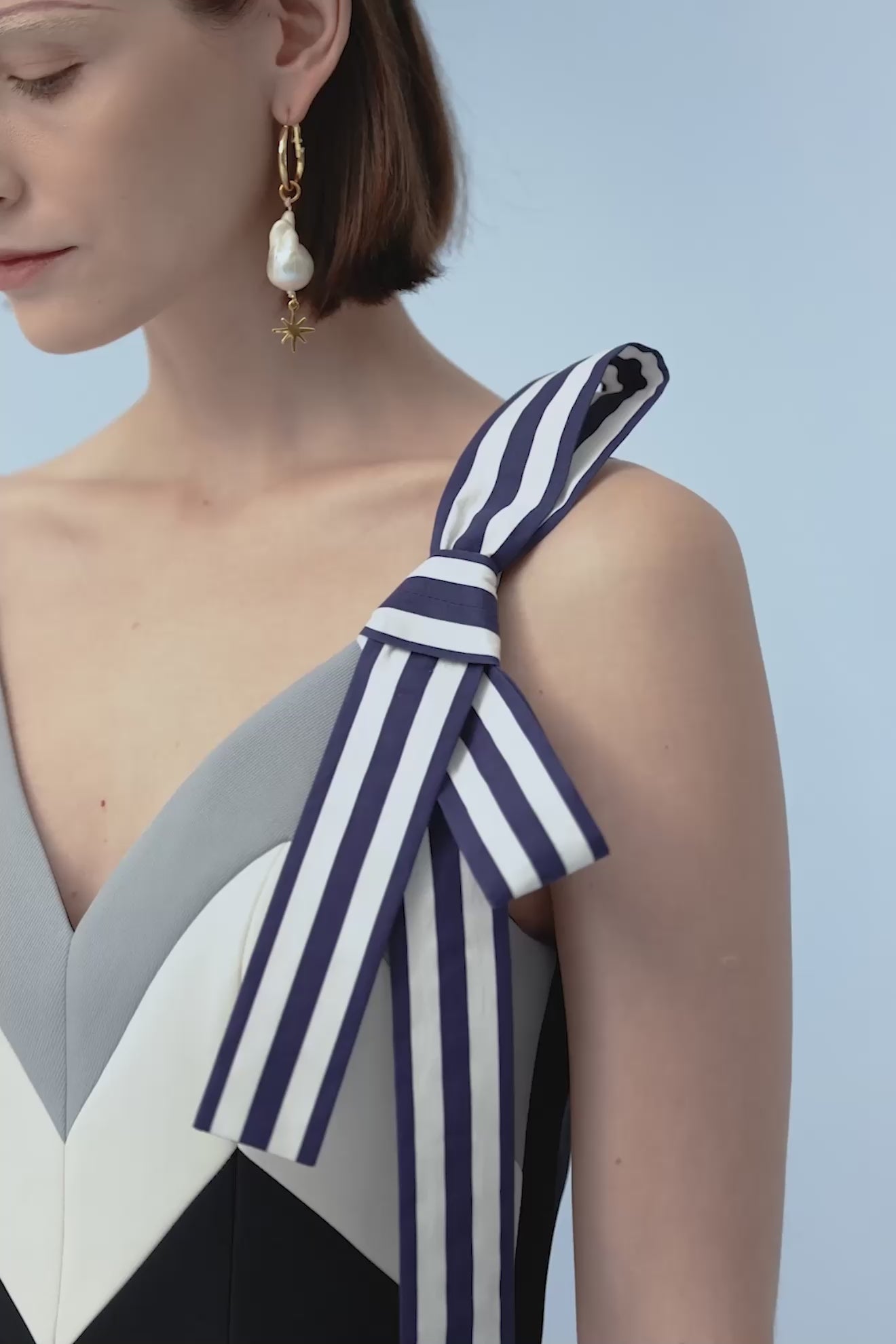 Color-block midi dress and an asymmetrical shoulder bow.