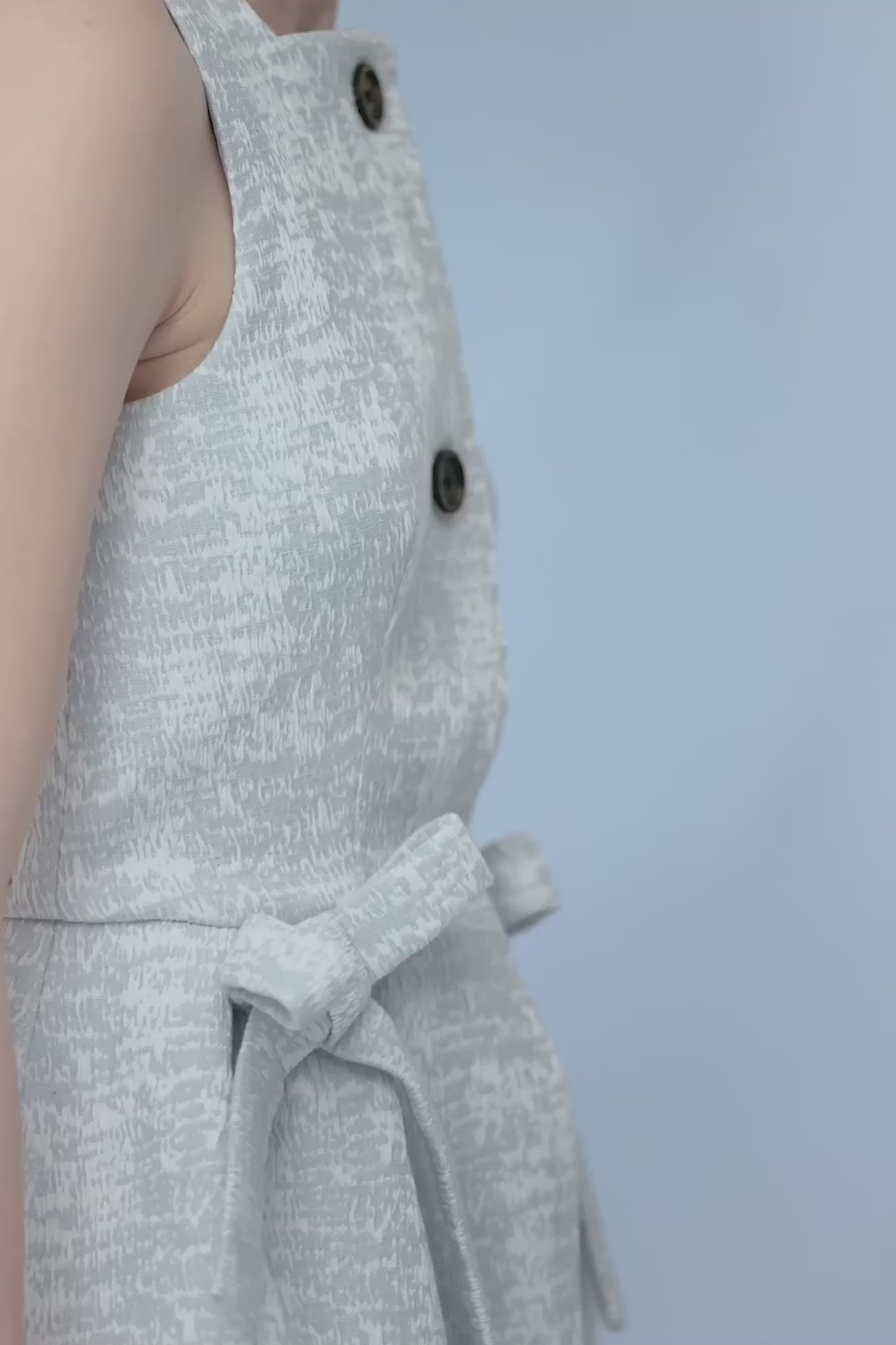 Sleeveless jacquard peplum top and playful side bows.